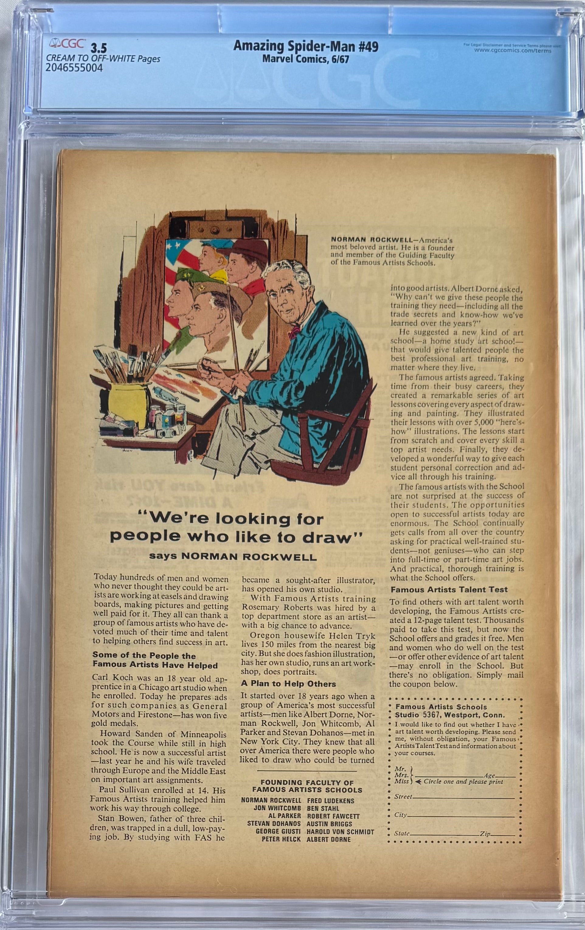 Current Value: As of June 2025, a CGC 3.5 copy of Amazing Spider-Man #49 typically sells for $80–$150, based on recent eBay and GoCollect data. The CGC 3.5 grade indicates good condition with noticeable wear, offering an accessible price point for Silver Age collectors. Demand for this issue remains steady due to its key villain appearances and Romita’s iconic artwork, even in lower grades.