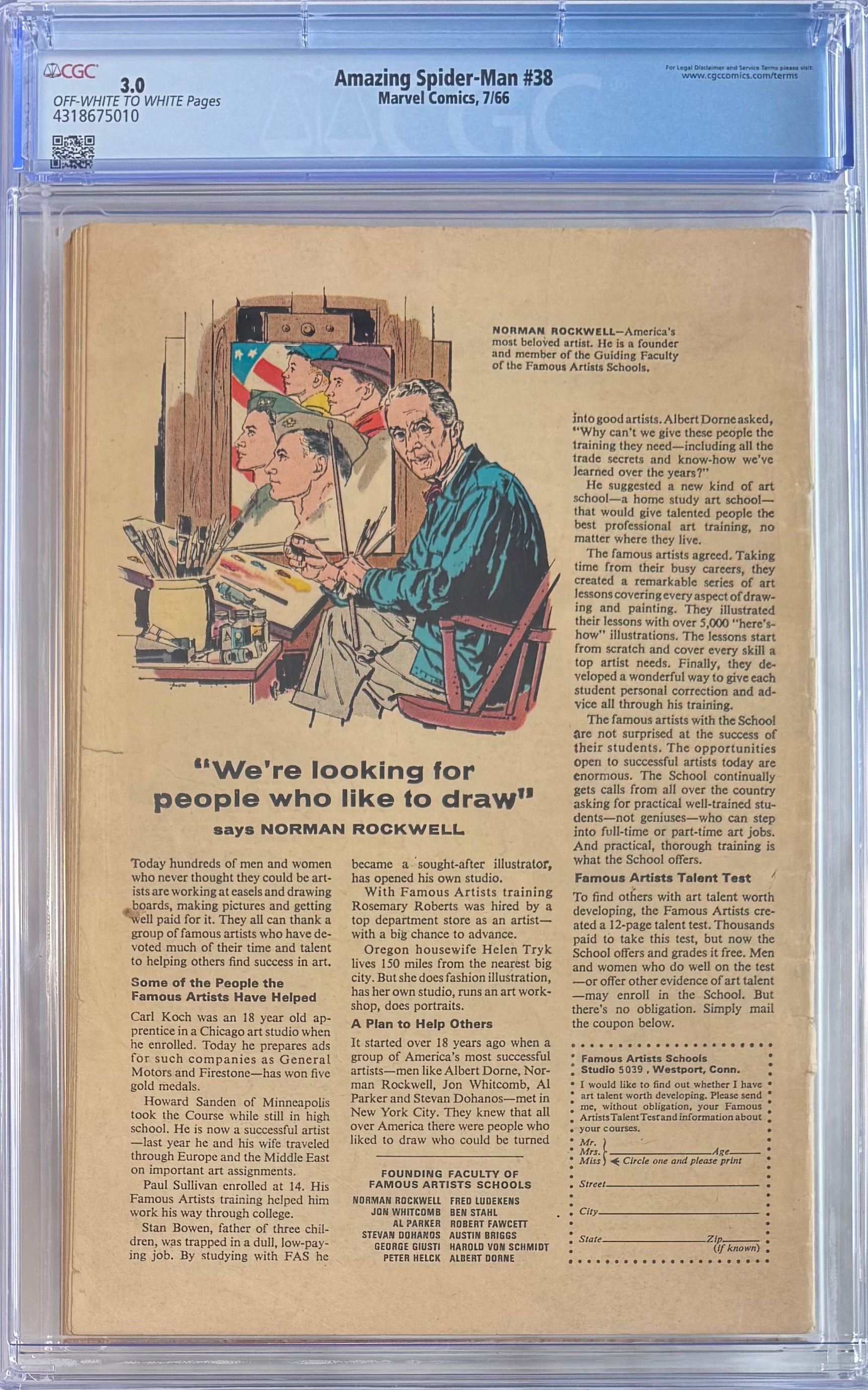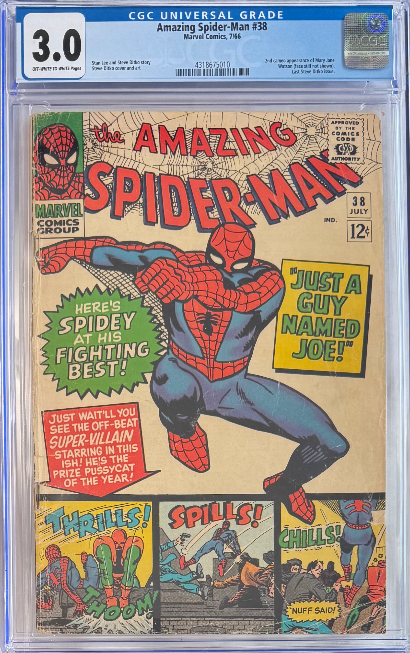 Recent eBay sales data suggest an FMV of approximately $100–$150 for Amazing Spider-Man #38 in CGC 3.0 with off-white pages. This reflects solid demand for low to mid-grade Silver Age Amazing Spider-Man issues, offering affordability for collectors seeking early series entries.Projected Fair Market Value & Trends