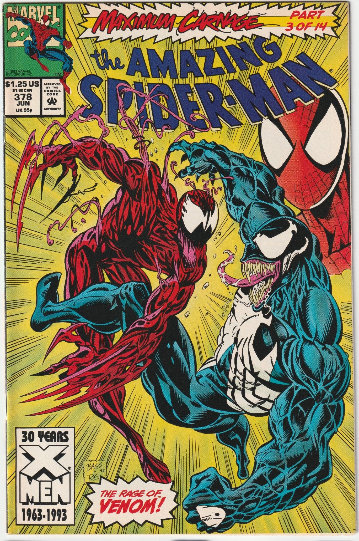 The Amazing Spider-Man (1963) #378—dropped on June 1, 1993—is a symbiote-soaked thrill ride that’ll stick to your brain like Venom on a bad hair day! Penned by the legendary David Michelinie and penciled by the iconic Mark Bagley, this issue is a ‘90s masterpiece that throws Spider-Man into a blender of chaos and hits “puree.” Say hello to Carnage, the red-headed psycho-stepchild of the symbiote family, tearing up the scene with more glee than a kid in a candy store with a chainsaw. Eddie Brock’s back too, proving Venom’s still got a grudge bigger than his biceps. Meanwhile, Mary Jane Watson’s holding down the fort, because even in a city crawling with monsters, someone’s gotta keep the Parker luck from tanking completely. It’s Spidey vs. the symbiote squad—place your bets!