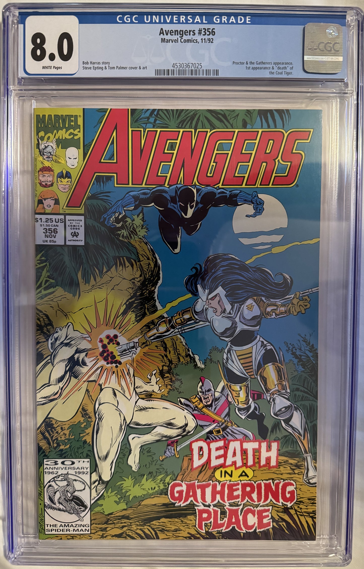 Avengers (1963) #356 (November 1992), written by Bob Harras with pencils by Steve Epting and inks by Tom Palmer, is a key Copper Age issue in the Avengers series, graded CGC 8.0 (Very Fine) with White Pages, ensuring excellent preservation. This issue, part of the “Gatherers Saga: Part 6 of 18” titled “Death in a Gathering Place,” marks the first appearance of Coal Tiger (an alternate-universe T’Challa), Proctor (the Gatherers’ leader), and the Gatherers (a multiversal villain team including Swordsman, Magdalene, Sloth, and Mother Cassandra). The story unfolds in Wakanda, where the Gatherers overwhelm Black Panther (T’Challa) to stabilize Coal Tiger, whose transition from Earth-355 to Earth-616 is killing him. Their plan requires killing Black Panther, but Coal Tiger, the last Avenger of his universe, convinces Swordsman to halt the process, choosing an honorable death to save T’Challa. The Avengers—Hercules, Sersi, Thor, and Vision—arrive via Lockjaw’s teleportation, engaging the Gatherers in a fierce battle. Wakandan soldiers and the Avengers force the Gatherers to flee, capturing Swordsman. Steve Epting’s art and Tom Palmer’s inks deliver dynamic visuals, with the cover showcasing the Wakanda conflict.