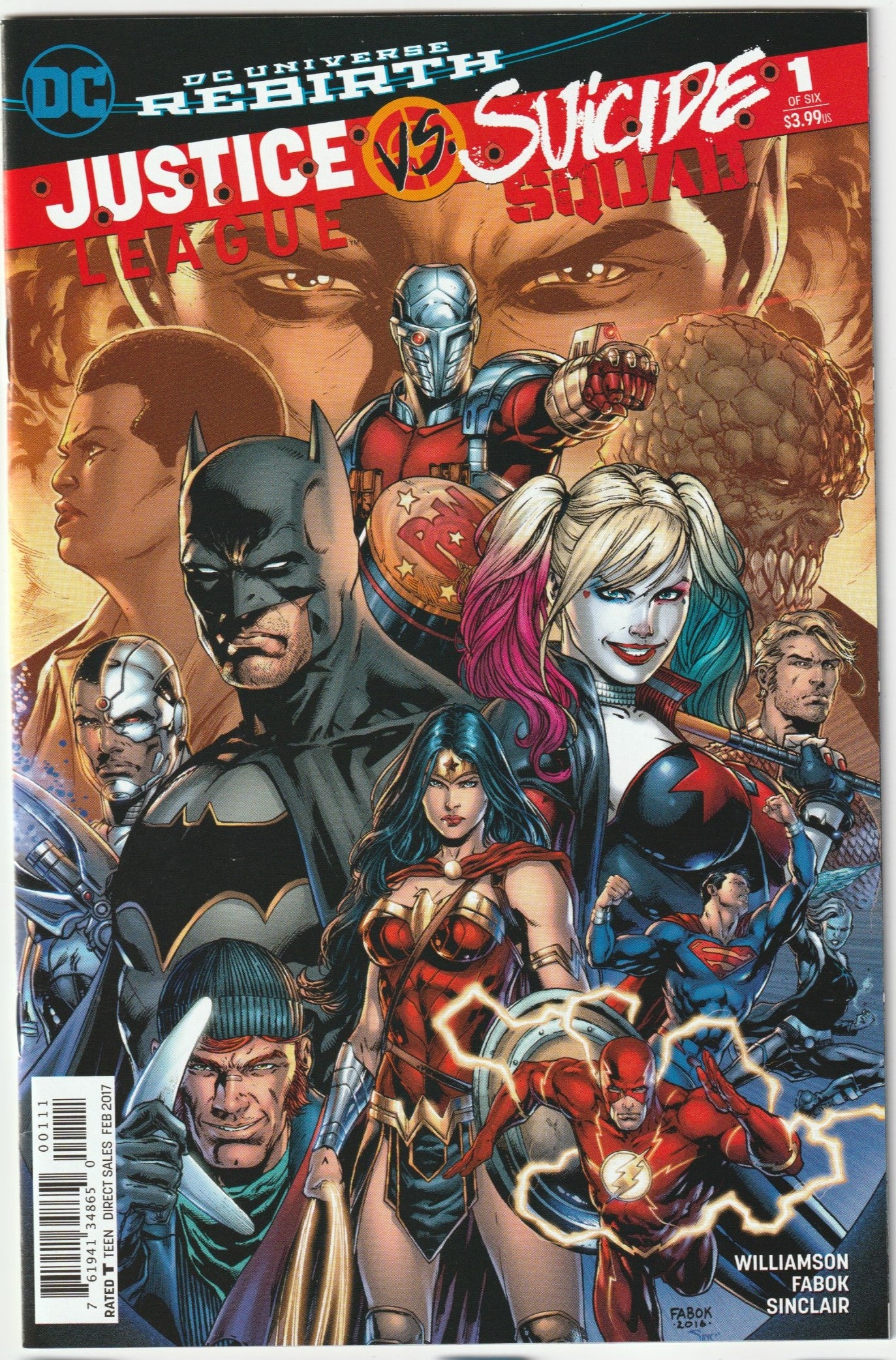 Justice League vs. Suicide Squad #1 (February 2017), written by Joshua Williamson with art and cover by Jason Fabok and colors by Alex Sinclair, is the first of a six-issue limited series, marking the inaugural major crossover event of DC’s Rebirth era. This 40-page issue, priced at $3.99 and rated T, kicks off with the Justice League—led by Batman, Superman, Wonder Woman, and others—discovering the existence of Amanda Waller’s covert Task Force X, the Suicide Squad, comprising black-ops villains like Harley Quinn, Deadshot, and Captain Boomerang with bombs implanted in their heads. The League, Earth’s paragons of justice, aims to shut down the Squad, sparking a fierce confrontation as Waller’s team refuses to yield. Meanwhile, a shadowy threat led by Maxwell Lord and his team of villains, the original Suicide Squad, emerges, setting the stage for a larger conflict that forces uneasy alliances. Fabok’s dynamic art captures the explosive hero-villain clash, making this a visually stunning opener to the event. The issue includes variant covers, such as the Tyler Kirkham Harley Quinn cover noted on X posts.