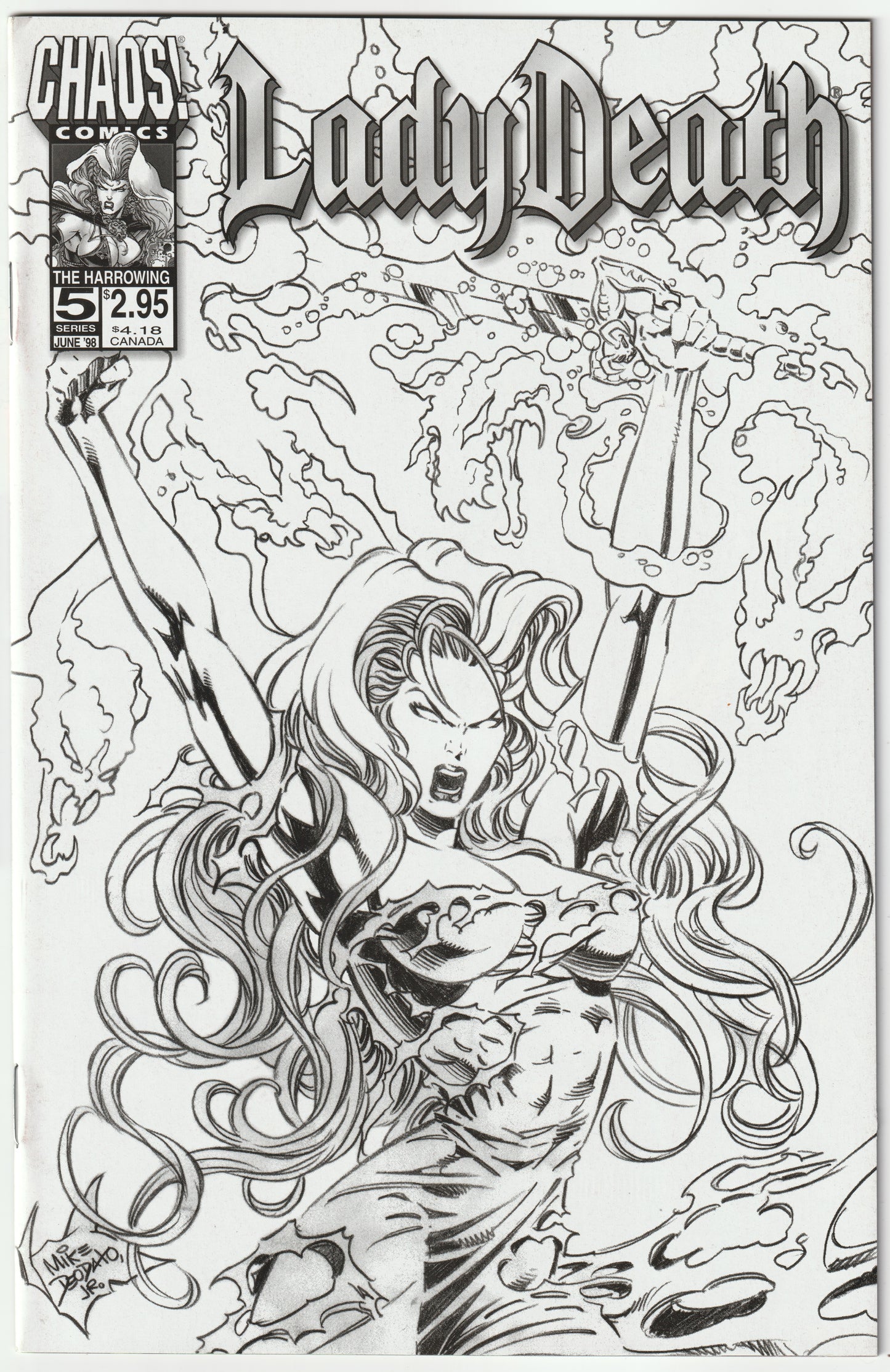 Secure the elusive Lady Death #5 – The Harrowing Black & White Sketch Variant, a 1998 Chaos! Comics release with a striking monochrome cover by Mike Deodato Jr. This limited variant, part of the Harrowing storyline, is a collector’s treasure and a high-potential investment for fans and speculators.
