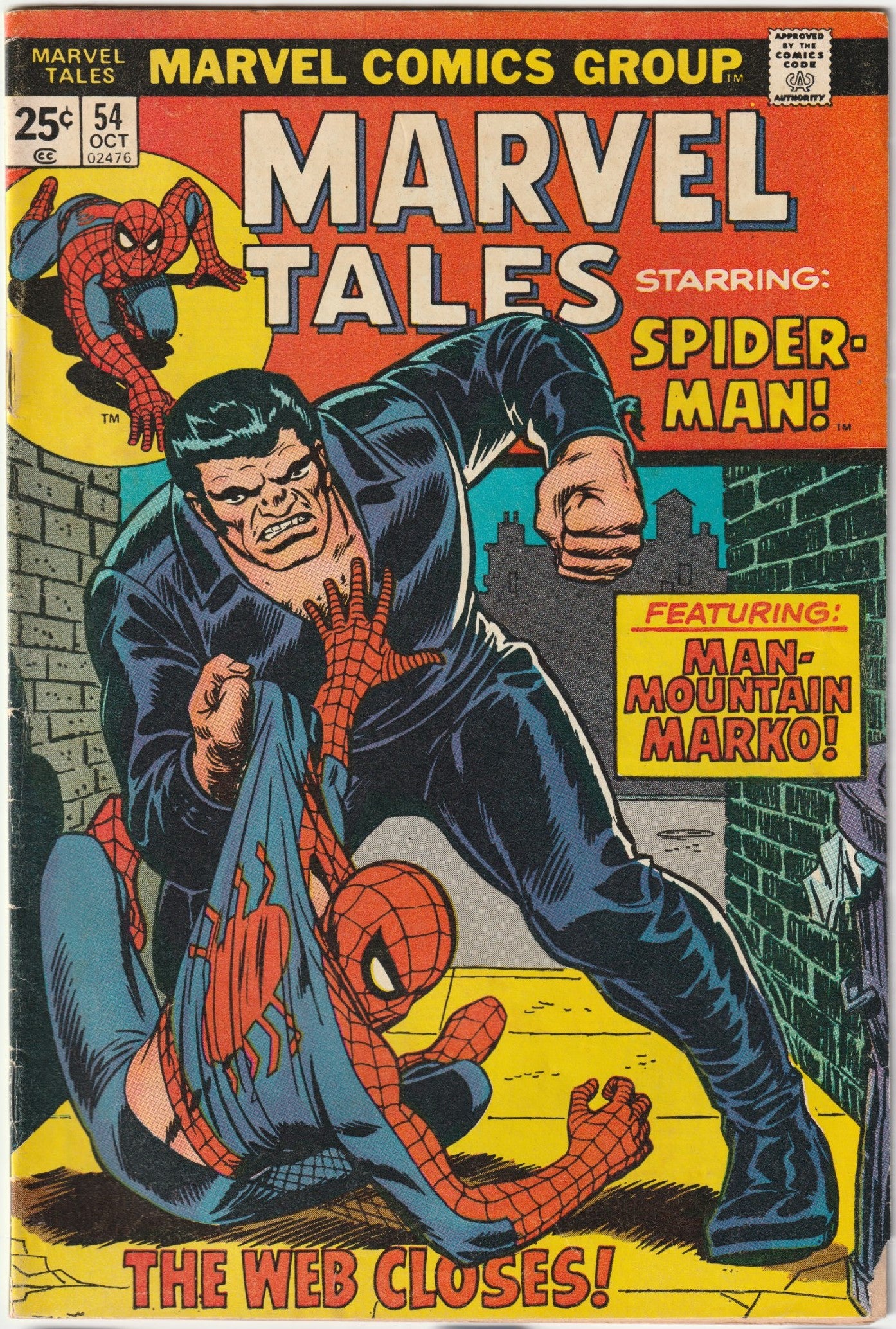 Marvel Tales Vol 2 #54 (reprinting Amazing Spider-Man #72), by Stan Lee and John Romita Sr., is a gripping Silver Age tale. Spider-Man visits George Stacy for leads on the Shocker’s stolen tablet, learning the address of Shocker’s ex-girlfriend. There, he battles Man-Mountain Marko, Silvermane’s enforcer, while Cesare Cicero, another goon, bails out a Kingpin operative to decode the tablet. At the Daily Bugle, J. Jonah Jameson fumes over pro-Spider-Man coverage, but Joe Robertson defends factual reporting. Marko throws the ex-girlfriend out a window, forcing Spidey to save her, letting Marko escape with the tablet. As Peter Parker, Spidey learns Curt Connors was abducted. Unbeknownst to him, Silvermane holds Connors to work on the tablet, ignoring Connors’ cryptic warnings.