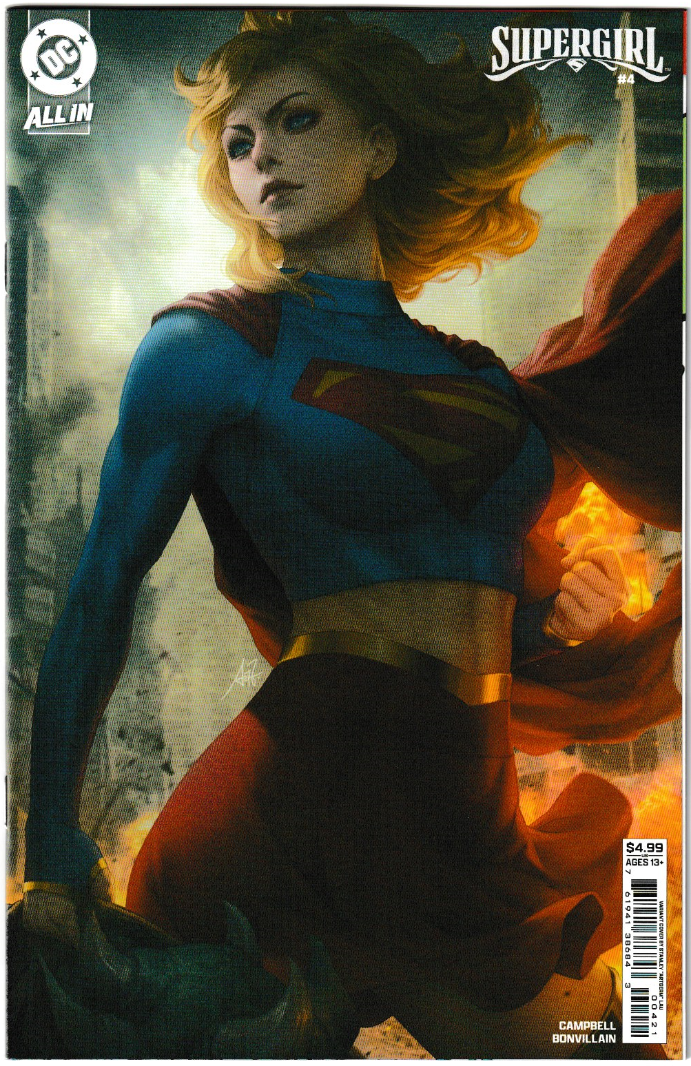 Supergirl #4 Cover B Stanley "Artgerm" Lau Card Stock Variant (DC Comics, 2025)Soar into action with Supergirl #4 Cover B by Stanley "Artgerm" Lau, a collector’s must-have from VegasComics.com! Released August 13, 2025, this DC “All In” issue features key appearances by Supergirl (Kara Zor-El), Lena Luthor II, and Lesla-Lar (Luminary). In “Girl’s Night Out,” Kara, unshackled from Superman’s oversight, explores Midvale’s secrets with Lena, uncovering a hidden club and facing the fallout of Lesla-Lar’s rampage. Written and drawn by Sophie Campbell, with Artgerm’s stunning card stock cover, this 32-page issue is a pivotal chapter in Kara’s rebellious journey.Current Fair Market Value: Retailing at $4.99, the Artgerm variant is listed at $3.99-$4.99 on sites like Midtown Comics and eBay, with NM copies averaging $5-$8 due to Artgerm’s fan-favorite art and card stock appeal.