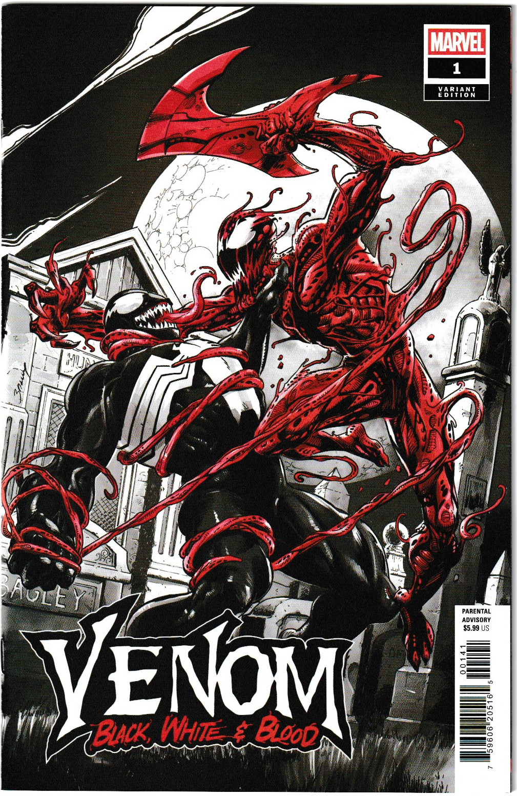 Venom: Black, White & Blood #1 Mark Bagley Variant (Marvel Comics, 2025)Unleash the symbiote savagery with Venom: Black, White & Blood #1 Mark Bagley Variant, a blood-drenched collectible from VegasComics.com! Released August 20, 2025, this 40-page anthology, written by David Michelinie, J.M. DeMatteis, and Ryan North, with art by Jonas Scharf, Dave Wachter, and Creees Lee, stars Eddie Brock (Venom). Three brutal tales unfold: Michelinie and Scharf send Venom into a jungle to shred a paramilitary outfit weaponizing his symbiote; DeMatteis and Wachter explore a dark family truth post-Maximum Carnage in “Fathers & Sons”; North and Lee deliver a kid-fueled revenge saga. Bagley’s black, white, and red cover screams lethal chaos.